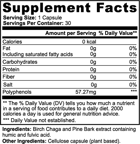 The combination of Birch Chaga and Pine Bark extract supports balanced gut flora and a harmonious digestive environment essential for comfortable digestion and nutrient absorption.