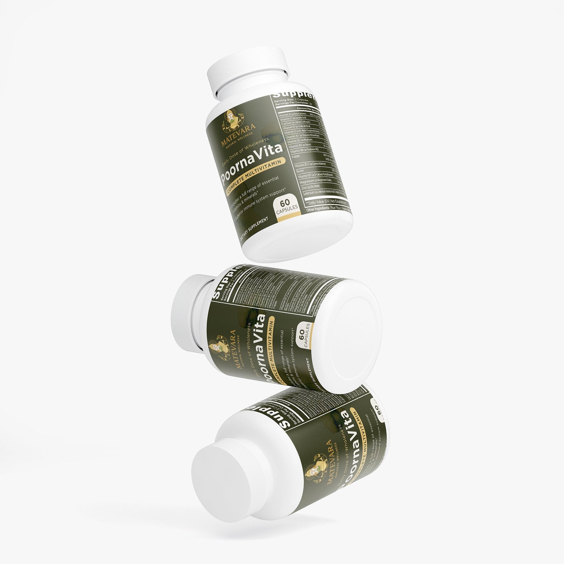 PoornaVita provides essential vitamins and minerals that support energy production, immune defense, bone health, muscle function, cognitive performance, and healthy aging.